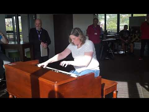 Insgesamt waren nicht ganz so viele Besucher gekommen wie im letzten Jahr (in unserem „HAMMOND-Heaven“ und auch beim Tastenfestival insgesamt), aber bei denen, die kamen, war das Interesse genauso groß. Die einen erkundigten sich eingehend über die Technik der elektromagnetischen HAMMONDs und nach unserem Verein, andere setzten sich an die Instrumente und griffen in die Tasten. Um die ganze Faszination zu erleben, die diese wundervollen Instrumente ausstrahlen, muss man sie live erleben. So ließen sich auch George Fleury und Pete Shaw, die im Festival-Programm auf anderen Instrumenten tätig waren, die Chance nicht entgehen, bei uns ihr ganzes Können auf einer echten HAMMOND zu zeigen. Und Claudia Hirschfeld sagte, als sie auf der A100 spielte: „Das macht ja richtig Spaß.“