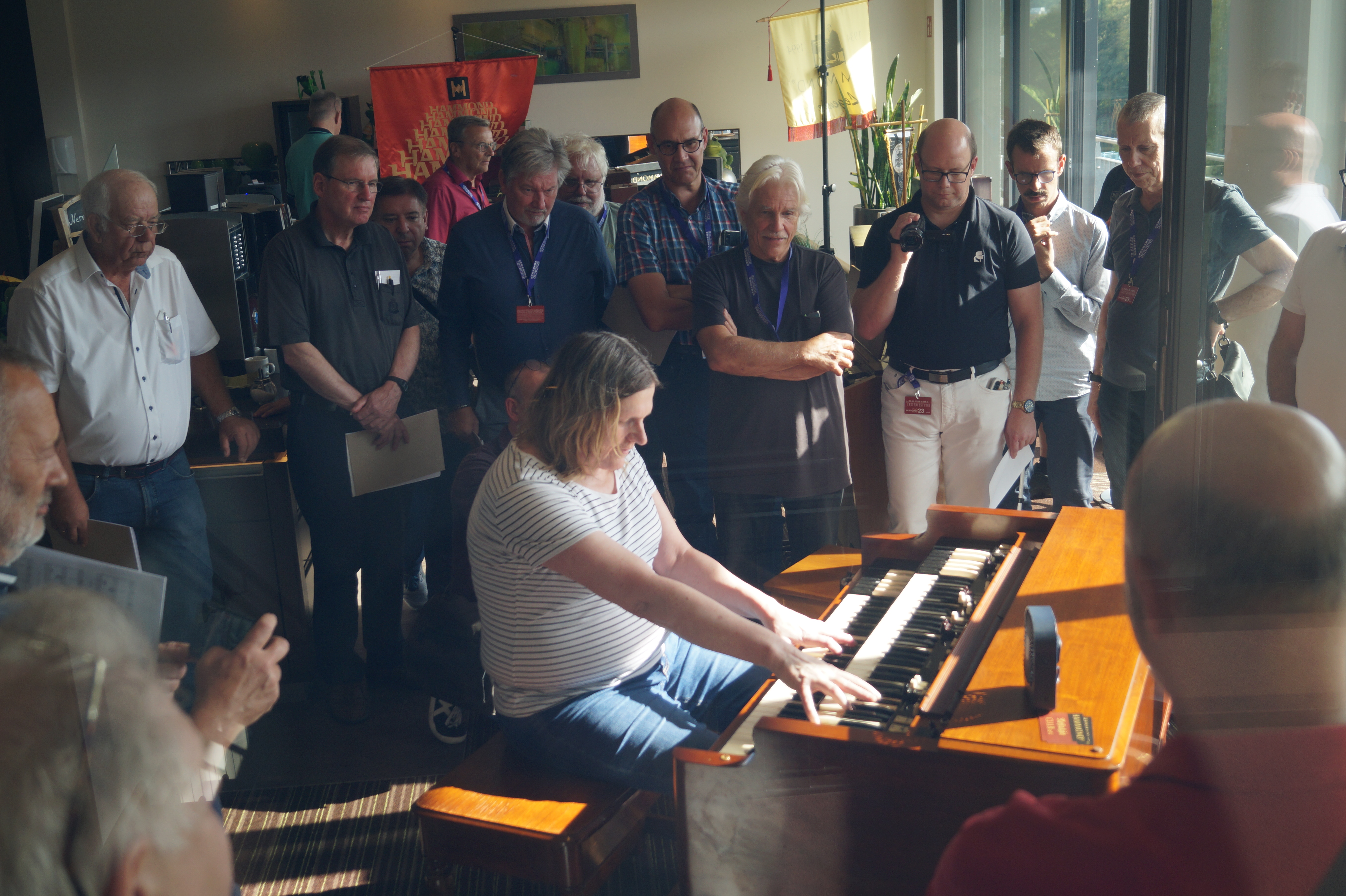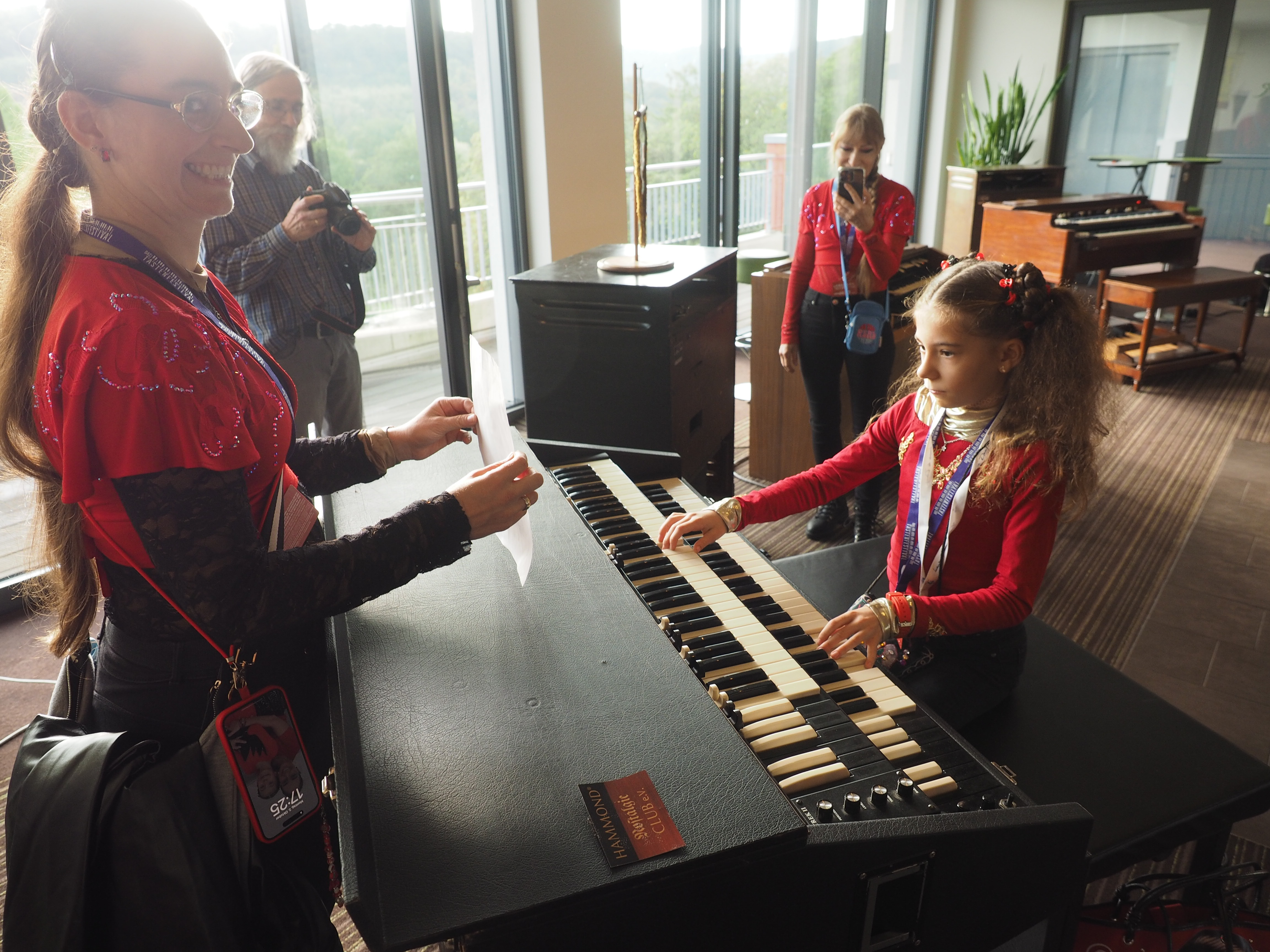 Die mit Abstand jüngste Besucherin war die neunjährige Verenice Heitsch: Sie lauerte auf eine Gelegenheit, dass kein Erwachsener auf den Orgeln spielte, setzte sich an die A100 und spielte Stücke, die sie im Keyboard-Unterricht gelernt hatte. Mit den für sie ungewohnten zwei Manualen kam sie sofort zurecht und sehr schnell auch mit den Zugriegeln und dem Leslie. Ihr war anzumerken, wie die HAMMOND sie in ihren Bann zog. Sehr gern wäre sie am nächsten Tag noch einmal gekommen, aber da waren die Ausstellungstage vorbei, und wir haben nur noch abgebaut. So zeigte sich einmal mehr: Die HAMMOND ist kein Überbleibsel vergangener Zeiten, sondern vermag nach wie vor Angehörige aller Generationen zu begeistern - wenn sie nur die Gelegenheit haben, hautnah mit ihr in Berührung zu kommen.