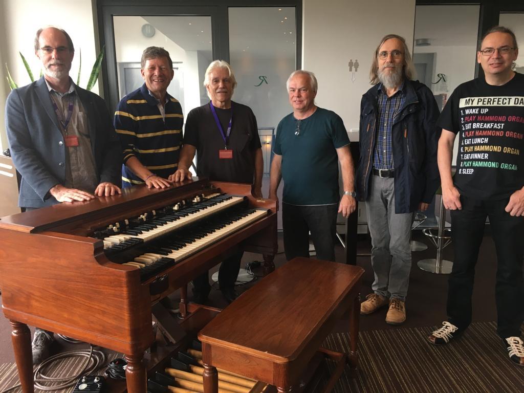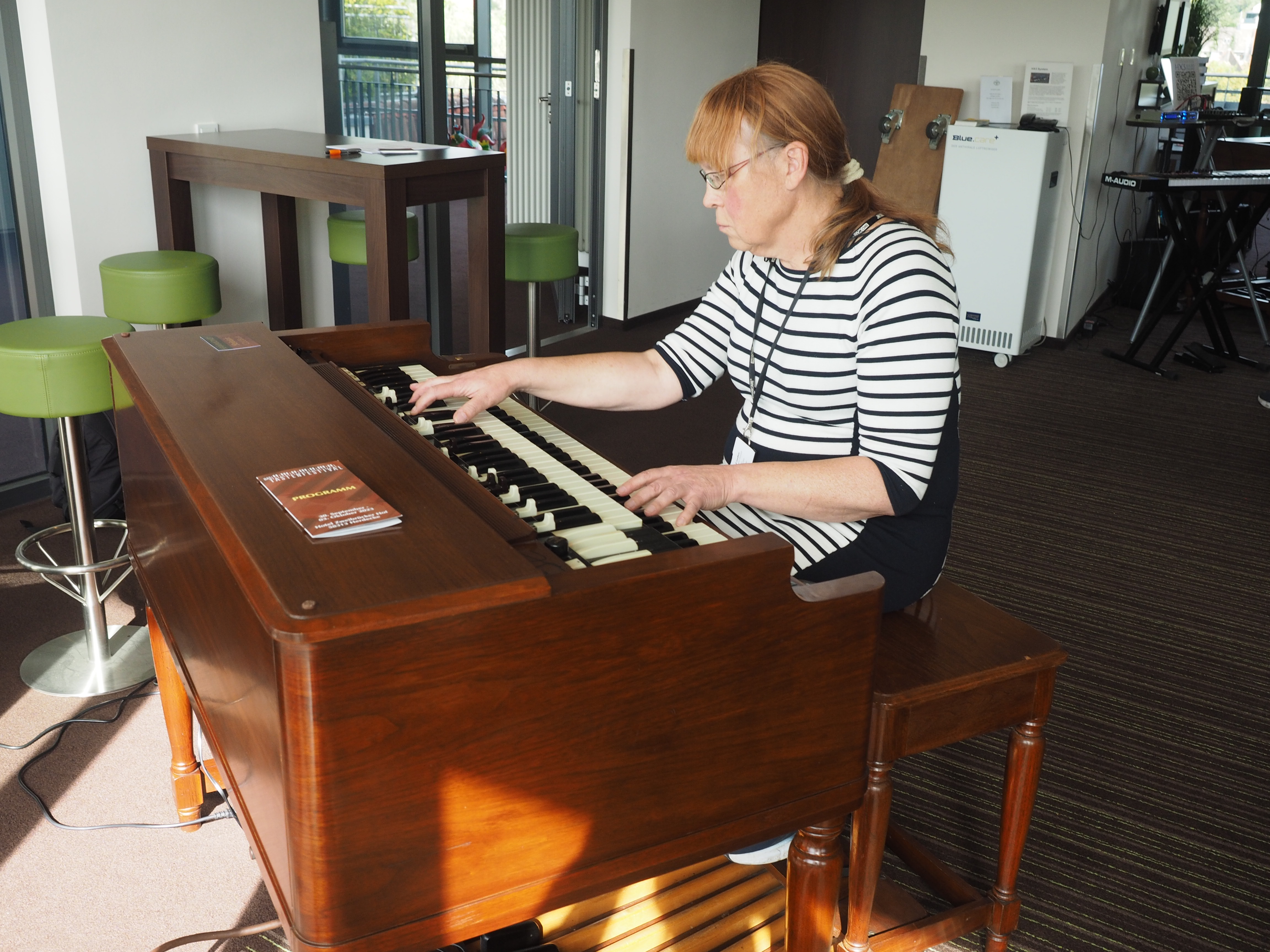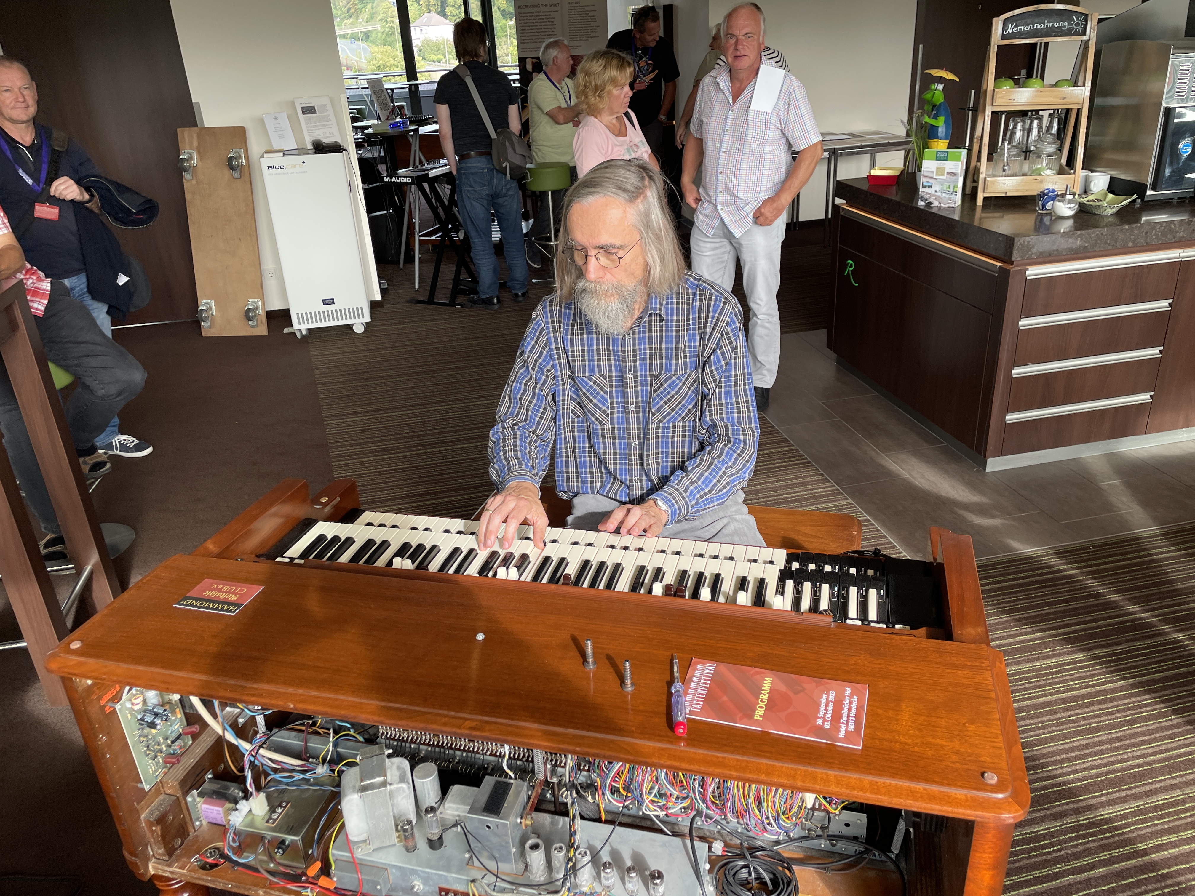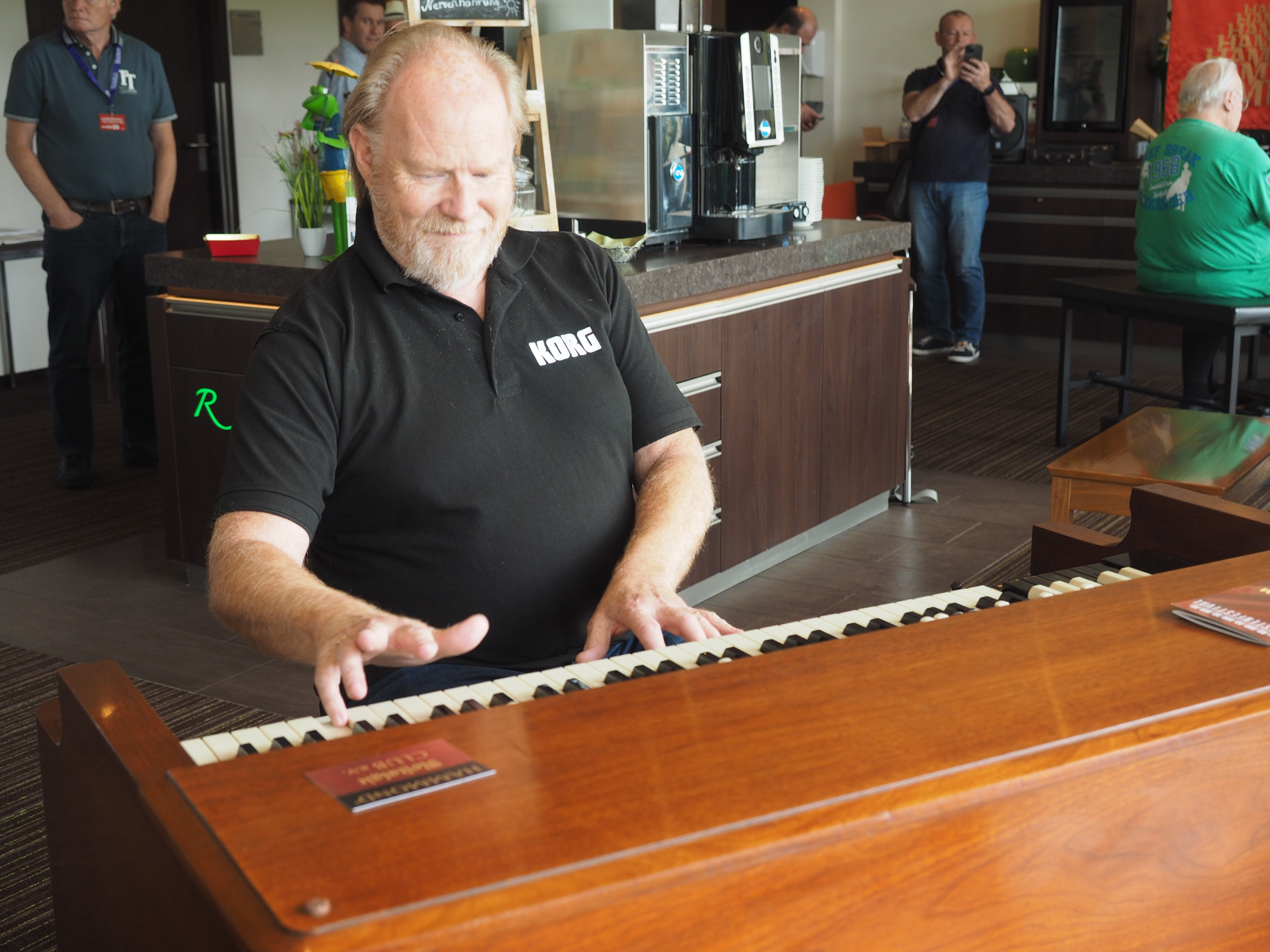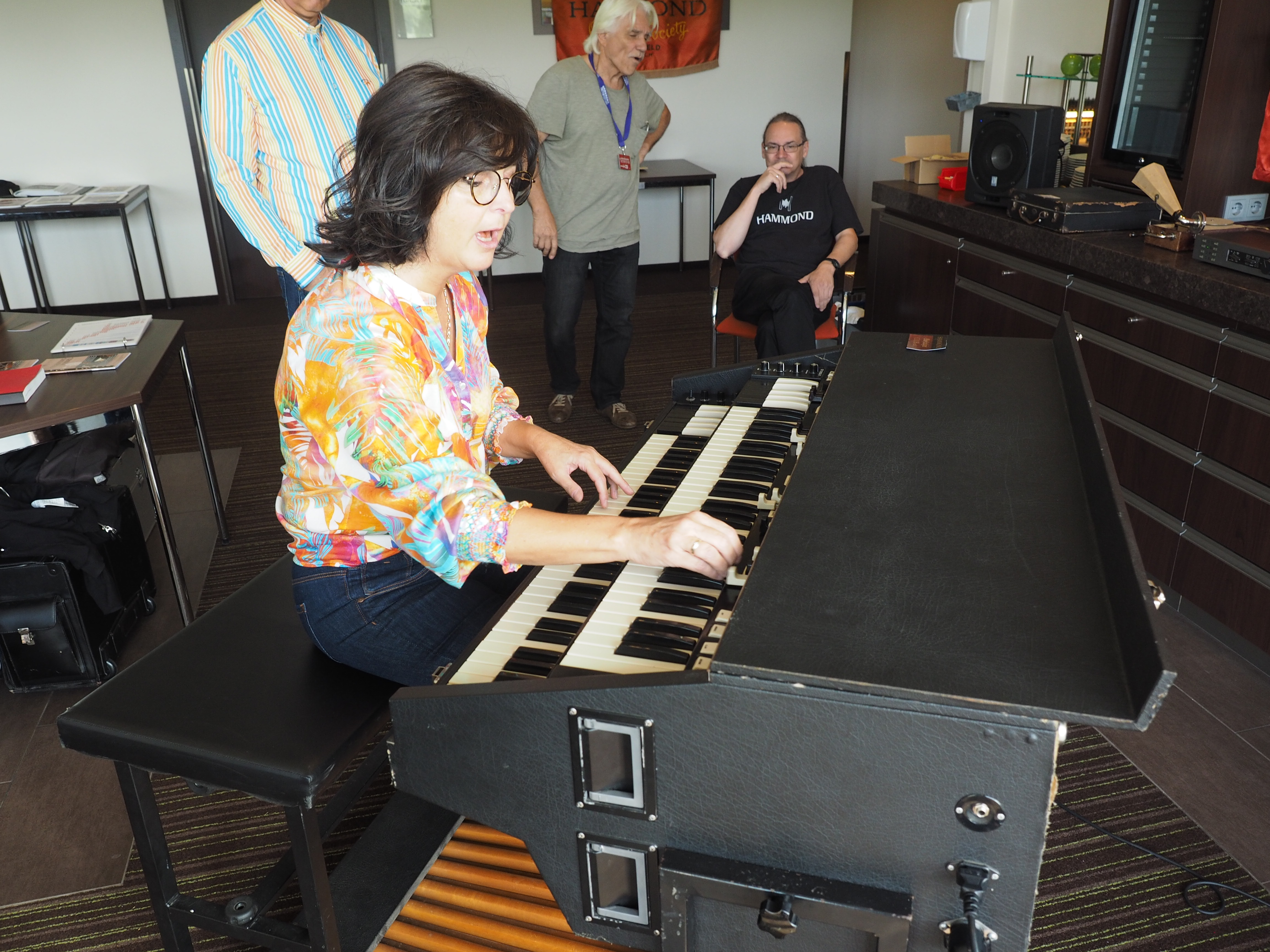 Insgesamt waren nicht ganz so viele Besucher gekommen wie im letzten Jahr (in unserem „HAMMOND-Heaven“ und auch beim Tastenfestival insgesamt), aber bei denen, die kamen, war das Interesse genauso groß. Die einen erkundigten sich eingehend über die Technik der elektromagnetischen HAMMONDs und nach unserem Verein, andere setzten sich an die Instrumente und griffen in die Tasten. Um die ganze Faszination zu erleben, die diese wundervollen Instrumente ausstrahlen, muss man sie live erleben. So ließen sich auch George Fleury und Pete Shaw, die im Festival-Programm auf anderen Instrumenten tätig waren, die Chance nicht entgehen, bei uns ihr ganzes Können auf einer echten HAMMOND zu zeigen. Und Claudia Hirschfeld sagte, als sie auf der A100 spielte: „Das macht ja richtig Spaß.“
